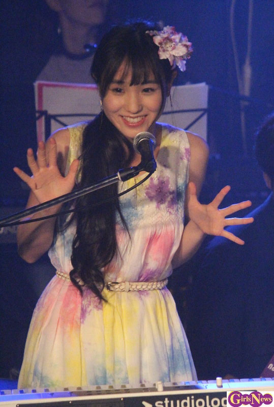 この日は、ギターとピアノのサポートメンバーが入った生バンド編成のステージ。ライブは人気曲『恋愛WARS』からスタートした。が本来、向かって左側、キーボードの前にいるはずの田﨑さんの姿がない。その姿はステージ後方の中央にあった! ドラムを激しく叩く田﨑さん、その意外な姿にファンはびっくりしていた。