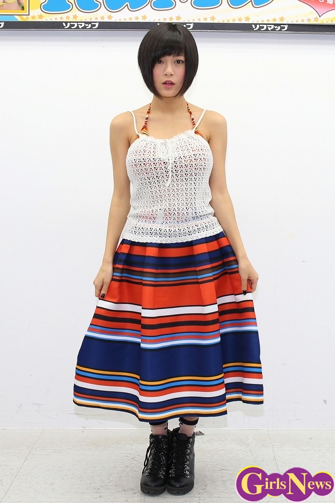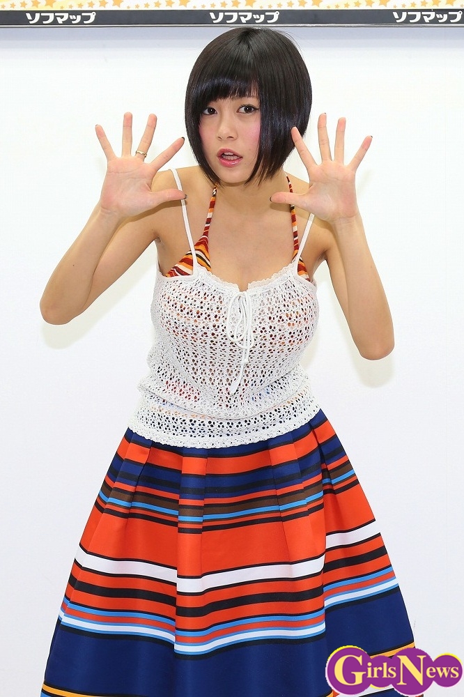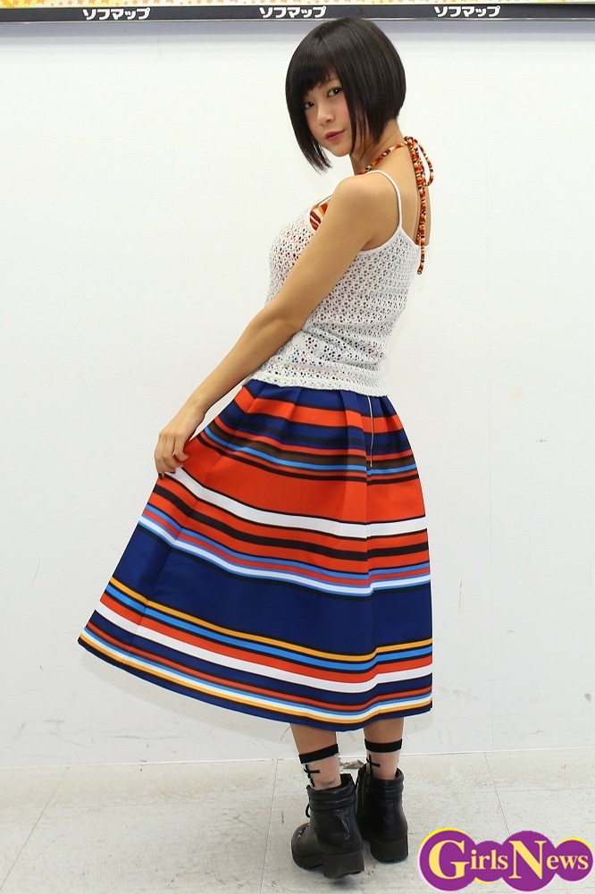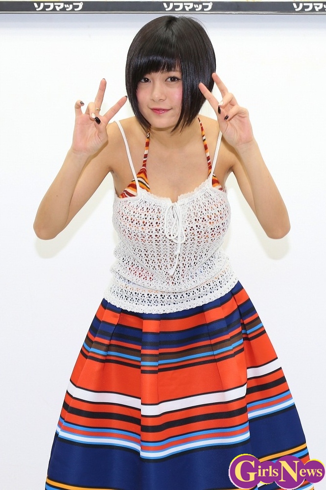 DVDの内容について「一緒にスイカを食べるシーンでは私は瓜アレルギーがあり、スイカを食べているところを見て『この子、アレルギーなのに頑張ってるな』と思いながら見て欲しい。セクシーなシーンは競泳水着。今回はV字型に前が開いていて、谷間に『人』の文字が出来ています。おすすめは浴衣のシーンで女の子のように?しっとりしています」と紹介。