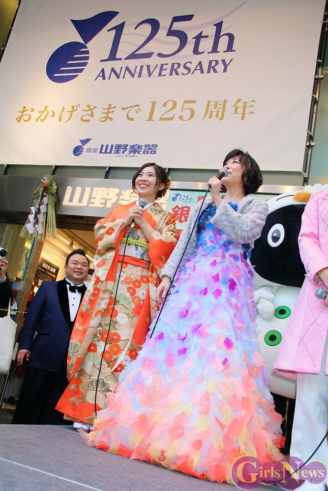 新春にふさわしい鮮やかなオレンジ色の振り袖姿で登場した岩佐さんは、同じレコード会社の水森かおりさん、三人組歌手のはやぶさと共に、集まったファンや足を止めた買い物客に「明けましておめでとうございます!」と笑顔で挨拶をした。