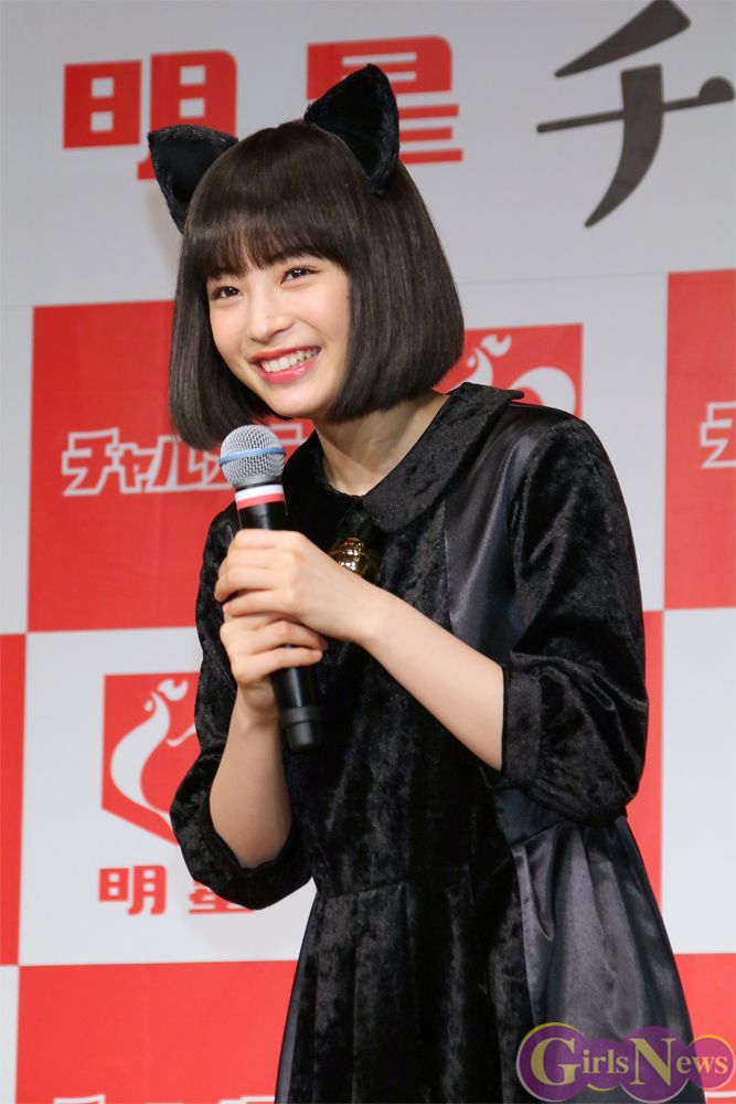 女優の広瀬すずが「明星チャルメラ」の新CMキャラクターに、ネコ耳に黒の衣装をまとった“すずネコ”として起用され、チャルメラならぬ「明星チャルメニャ発表会」に登場した。