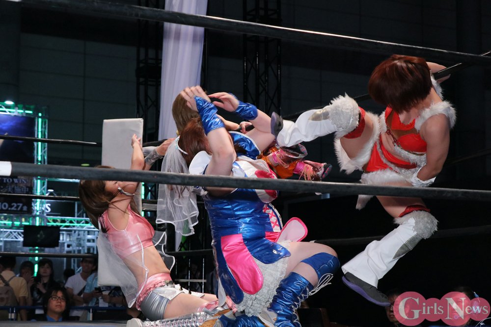 東京女子プロレスの提供試合が幕張メッセで21日より開催中の東京ゲームショウ・4Gamerブースで開催されている(一般公開は23・24日)。ビジネスデー初日には、「滝川あずさ&のの子」vs「坂崎ユカ&中島翔子」のタッグ戦が展開された。