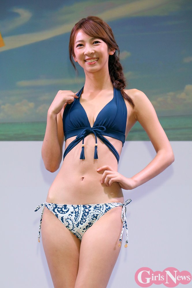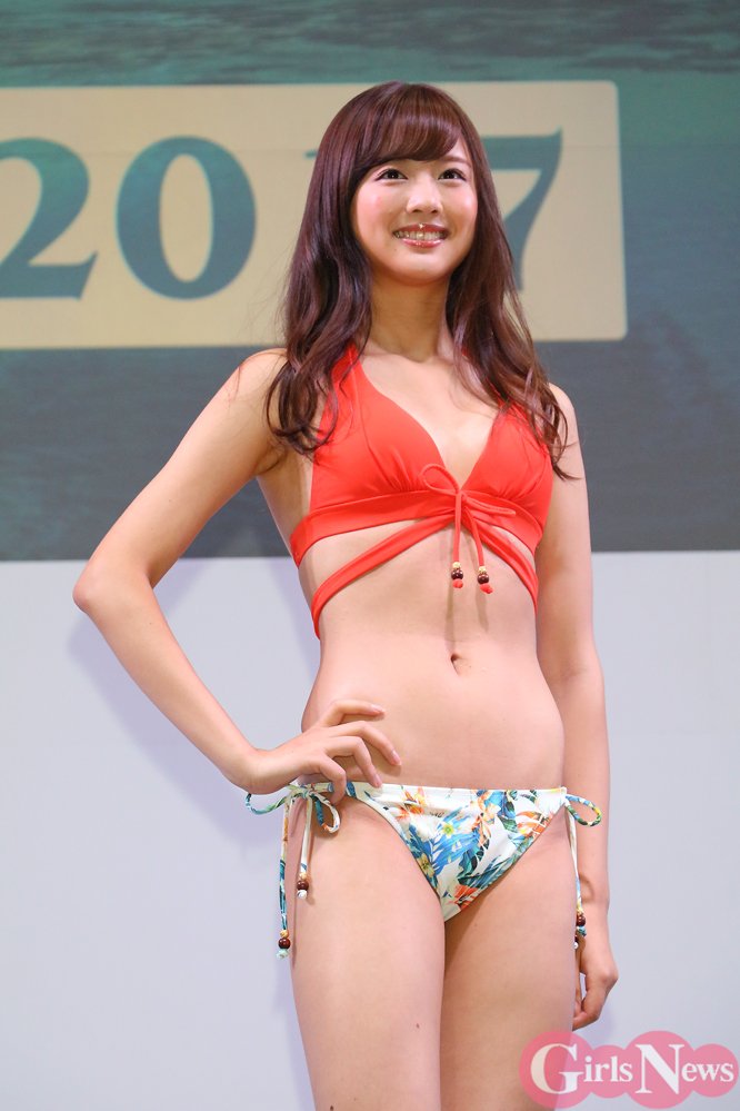 水着ショーには熊江さんのほかにレイニー(マカロンビーチイメージモデル)、鈴菜(なぎさイメージガール)、中西渚(ミスユニバース和歌山県代表)、太田麻美(LEON RACING LADY)が出演し、トレンドのクロスデザインの水着などを披露した。