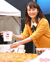 会場に登場した1000人分のおいも型巨大アップルパイに興奮していた新井さんはフラッグをさしてデコレーションを完成させ、ステージ上ではさつまいもを使ったパフェ作成を実演してさつまいもを大いにアピールしていた。