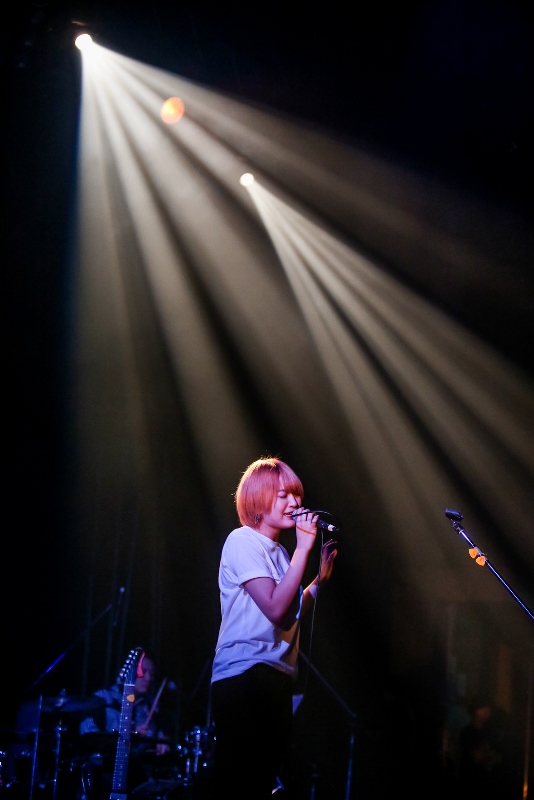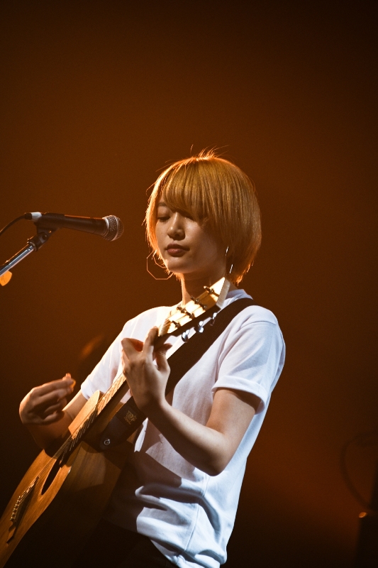 この日のい服装は白のTシャツにブラックデニムというスタイル。そのシンプルさに最近、切ったという金髪のショート・ボブが映える。「今日が初ライブなので、よろしくお願いします」というMCから未発表曲『ピローケース』、『夏色の君』と続け、最後に配信がスタートしたばかりの新曲『東京』と全4曲のソロ初ステージを終えた。