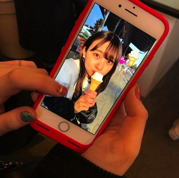 動画は、インスタグラムストーリー用の数秒間ループ動画で、ソフトクリームを持った渡邉さんが左右に動くところを収めてあり、また、アプリを使ってあるため、左右への動きが少し早くコミカルになっている。