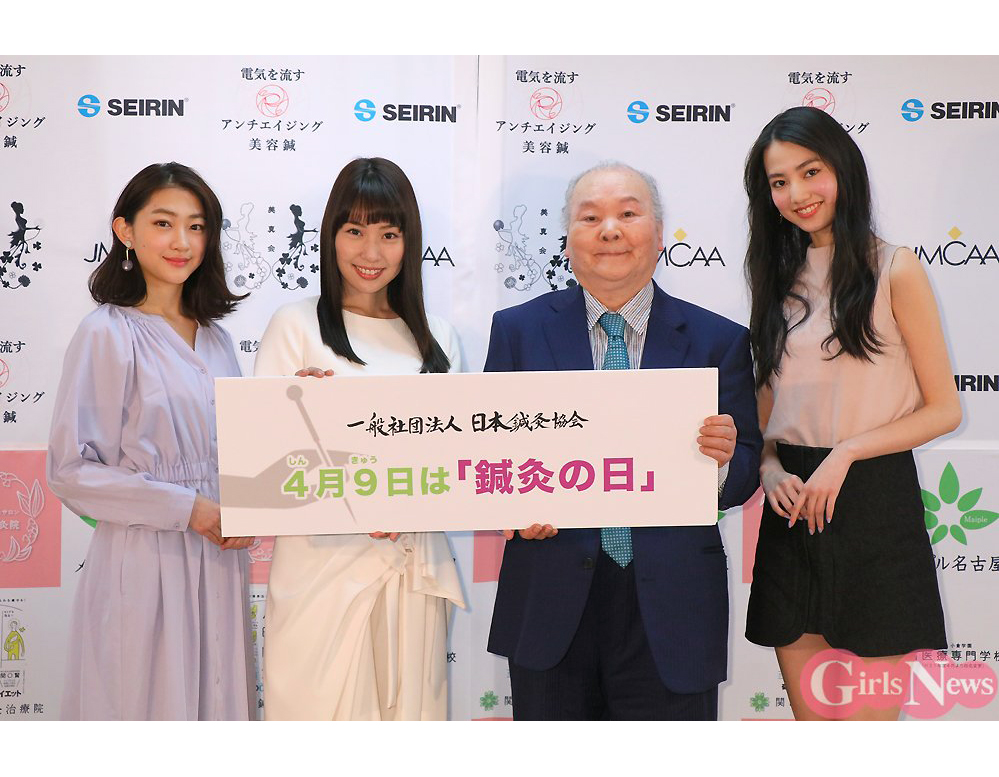 4月9日の「鍼灸の日」を記念したイベントにモデルの田辺かほ、元AKB48の増田有華、三愛水着楽園イメージガールの黒木麗奈が参加し、美容鍼の施術体験を行なった。