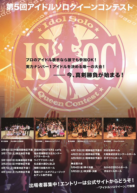 実力ナンバー1アイドルを決める大会として注目される「アイドルソロクイーンコンテスト」。その第5回の全国大会が4日、5日の2日間に開催。全国各地の予選会を勝ち抜いて来た総勢88名の実力派アイドルが東京に集結して決選大会が行われる。