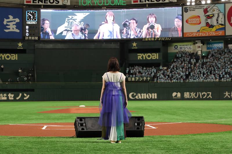試合開始前の会場内に、ホワイトとロイヤルブルーのドレスを身に纏った大原さんが呼び込まれてグランドに登場すると、会場は大きな歓声にわいた。スクリーン上に国旗が映し出されると、可憐なドレス姿で静かに力強く「君が代」を歌い出した。緊張度の高い今回の国歌独唱の場だったが、堂々とした迫力のある独唱となった。
