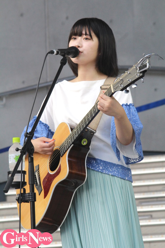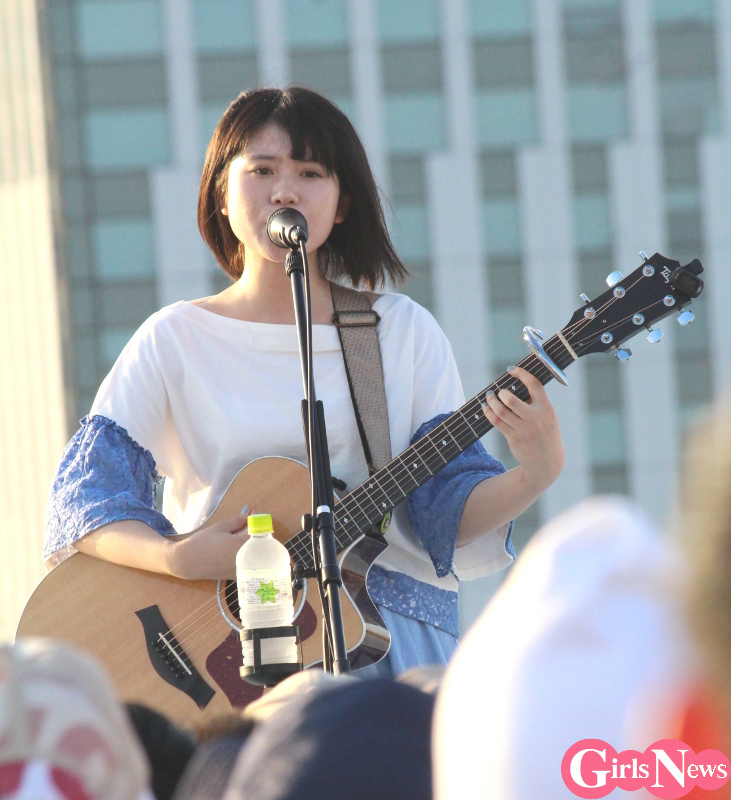多くのアイドルグループが笑顔満開のパフォーマンスを披露し、弾けるような歌声が響きわたるガンダム広場で、凛とした表情で、ギターを弾きなながら一つ一つの言葉を大事そうに歌う原田さんのステージは、ほかにはない独特の空気感を醸し出していた。