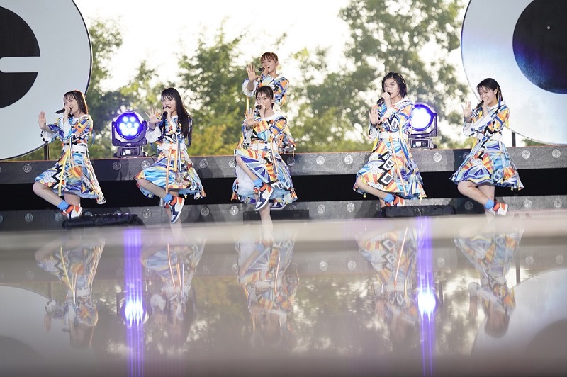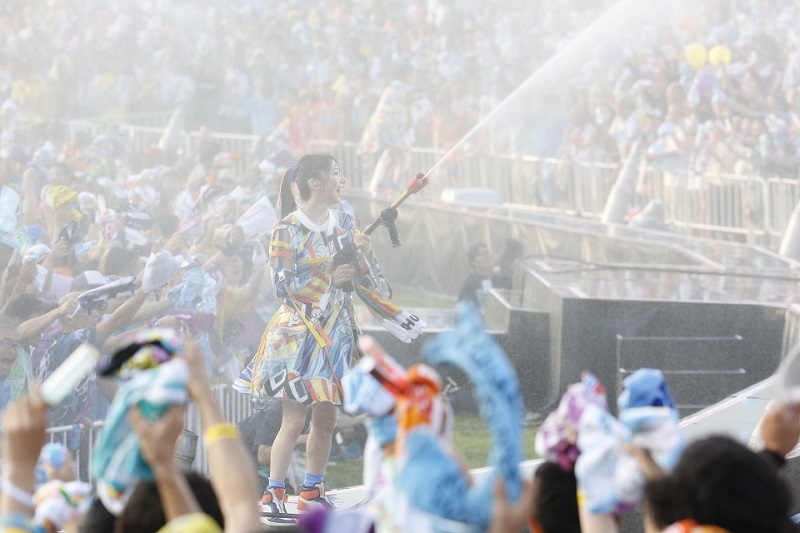 自己紹介を終え、「あたしきっと無限ルーパー」「YELL」「テブラデスキー~青春リバティ~」に続き、「MISSION SURVIVOR」では、風船が入った巨大なバルーンボールが客席に出現。さらには、放水銃をもったメンバーが観客席に向かって水を放ちファミリーをずぶぬれにして盛り上げる。「元気しかない!」では、メンバーが客席の間を水風船を投げつけながら駆け抜けるといった、水・水・水の演出で会場は大興奮。今年の『ファミえん』では、なんと約30トンもの水が使われる迫力ある演出が続いた。