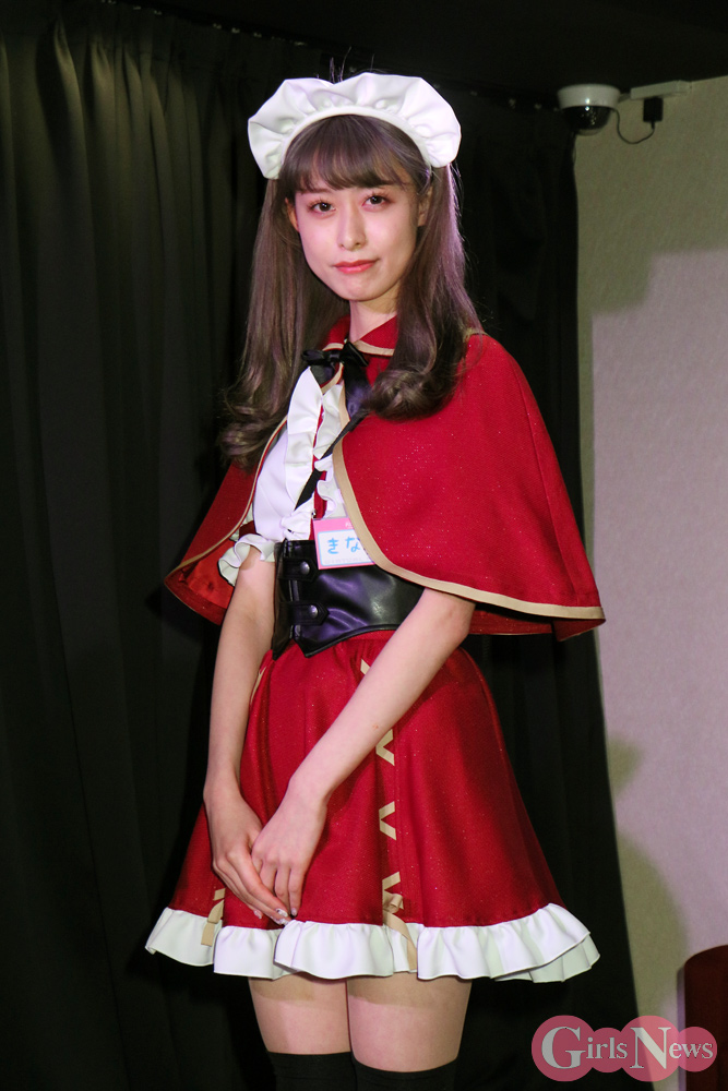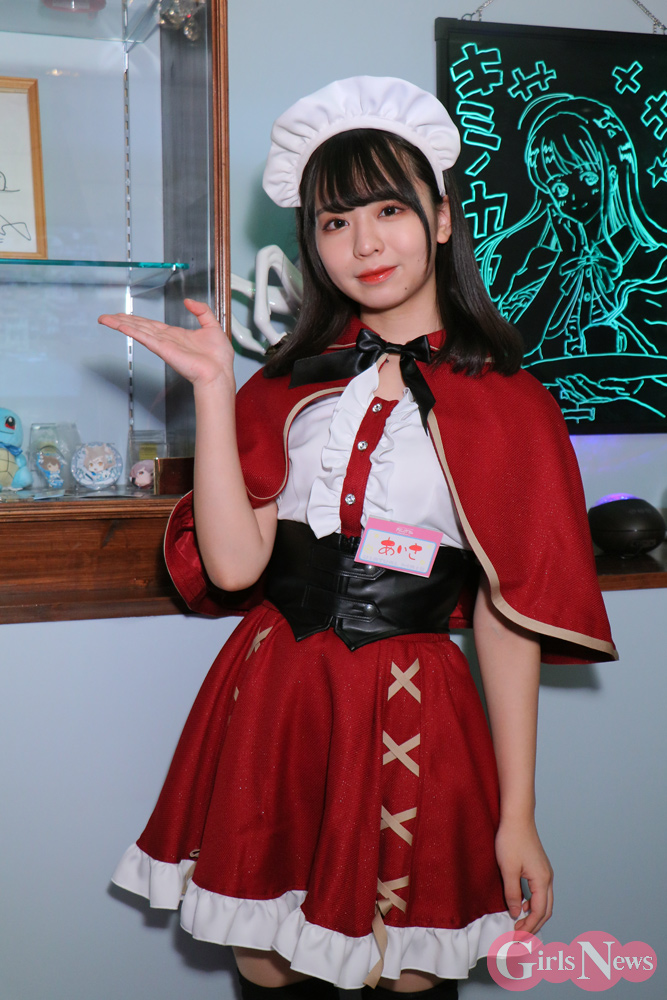 Vメイドの1人として登壇した、アイドルグループ「キミノマワリ。」のメンバー・小椋あい彩さんは、お店の印象を「サイバーな感じの内装や、プロジェクターなどもあって、すごくワクワクします」と紹介。自身がデザインしたというメイド服について「自分の絵をこんなに可愛く仕上げていただいて嬉しい。フリフリした感じとか、ウエストが締まって見えるところがポイント。ケープの着け離しで印象が変わるところにも注目して」とアピールした。