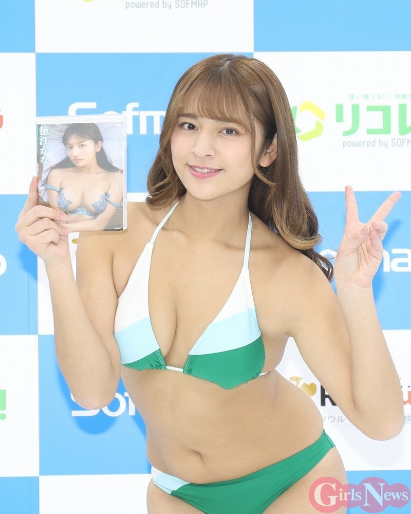 グラビアアイドルの徳江かなさんがDVD『日焼けした彼女をずっと忘れない』の発売記念イベントを24日、ソフマップAKIBA(1)号店サブカル・モバイル館で開催した。