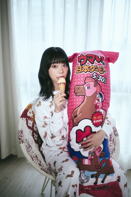そして「前に競馬場で撮影をしたことがあり、本物の馬を間近で見る機会があったんですが、本当に迫力があって一瞬怖さを感じましたね(笑)。けど、馬は繊細で人の感情を読み取る?っていうのかな、怖いってことをわからせてしまったら危ないって言われたのでナウシカの様に、接した記憶があります(笑)。「怖くない…怖くないよ…?」と心の中で唱えてました 実際に撮影で一緒に撮った馬は、すでに引退していたので落ち着いていました! ほかの馬にも、出会いましたが何事もなく接して、馬可愛いな~って思って楽しかったです! この仕事をしてなければ、馬のお世話をしている厩務員になりたいかなー!と思わせてくれる撮影でしたね。実際は大変だと思いますけど、調教師さんもすごいと思いました! 機会があったら1日体験などしてみたいです!」とエピソードを明かした。