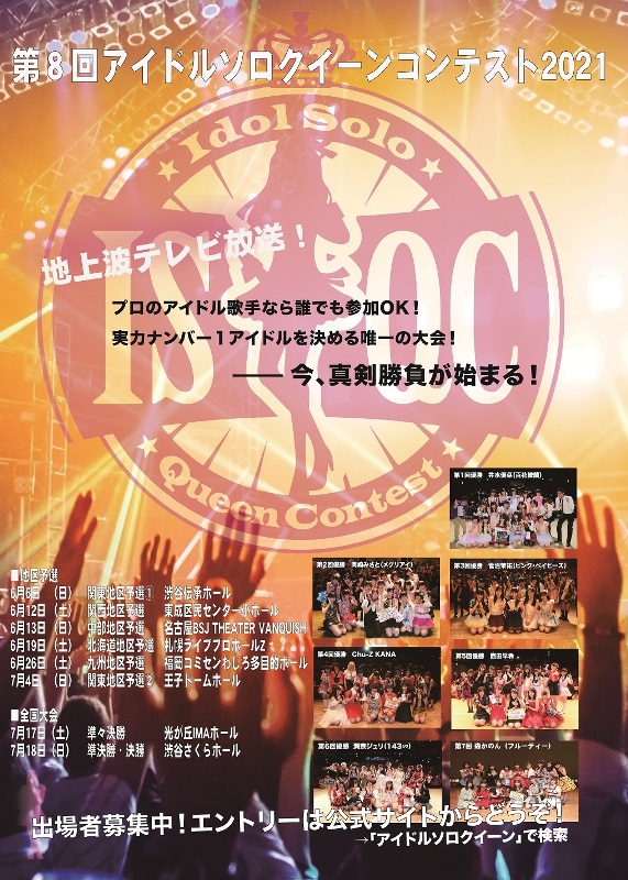 アイドルのソロの実力ナンバー1を決める第8回アイドルソロクイーンコンテストの全国大会が、7月17日(土)光が丘IMAホール、18日(日)に渋谷さくらホールで開催される。