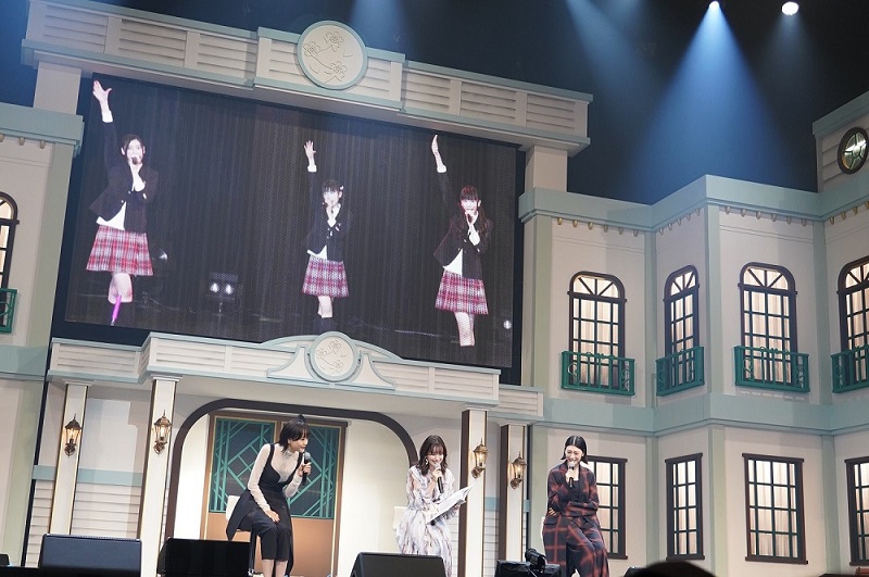 中盤では、恒例の1年間の活動を振り返る映像「さくら学院のあゆみ」が。この日は、歴代メンバーの転入したばかりの初々しい様子と卒業公演の模様が年代順に映し出された。その余韻が残るステージに、武藤彩未、三吉彩花、松井愛莉の初代卒業生が登場。初代メンバーが在籍した2年間を映像とトークで振り返る。さくら学院初ステージのTOKYO IDOL FESTIVALの映像では、初々しい自分たちの姿を見て恥ずかしがる3人。3人でユニットを組んだ3.a.mに話が至ると、振り付けをなかなか覚えられなかったという松井が「レッスン中の(2人の)目線がすごい怖かったんです」と訴えるなど思い出話に花を咲かせた。
