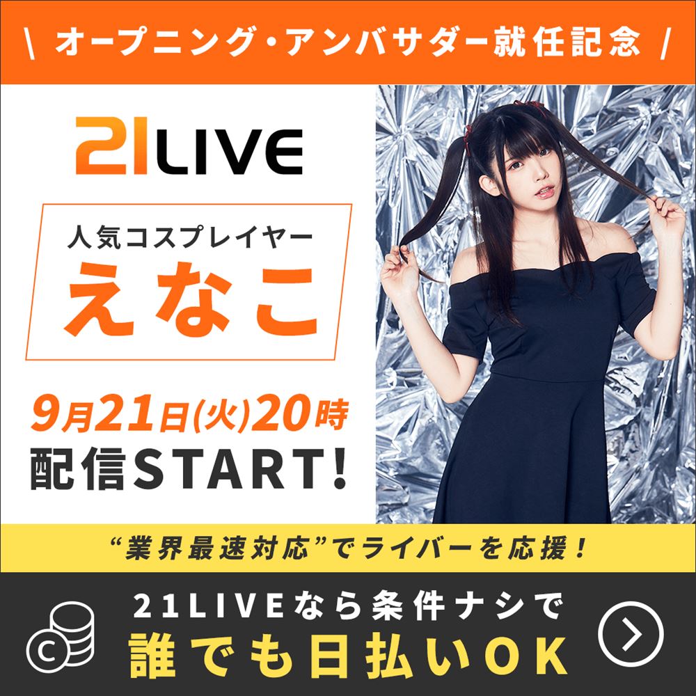 人気コスプレイヤー えなこが、オープニングアンバサダーを務めるエンターテインメント・ライブ配信サイト「21LIVE(ニーイチライブ)」にて、スペシャルライブ配信イベントを21日20時より開催する。