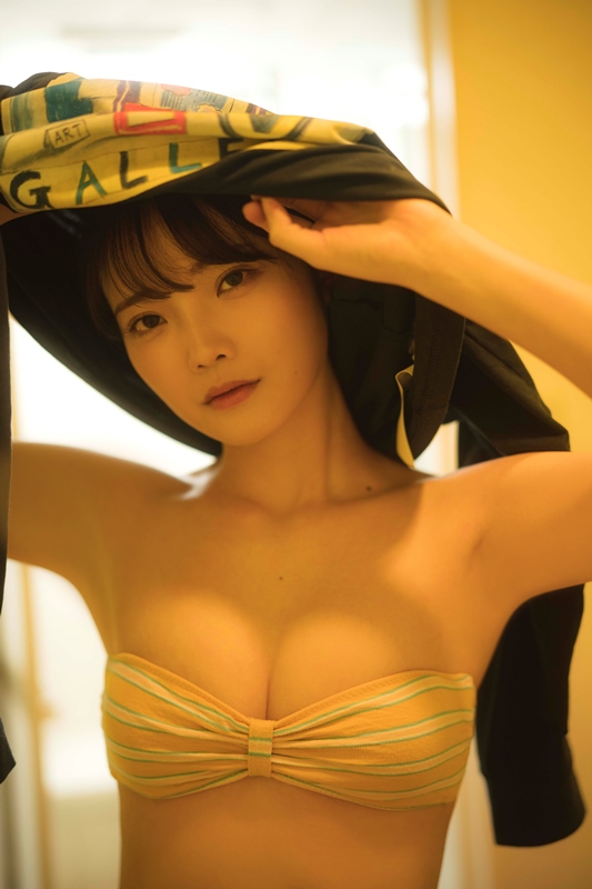 今回の撮影では「たくさん可愛い衣装も着れて、可愛いお洋服も着れました! 一番お気に入りは、水色のワンピース水着です。個人的に凄く好みな色っていうのもありますが、髪型も含め結構好きな感じでした!この日は凄く寒かったので、寒そうな表情をしないように頑張ってましたね(笑)」と感想を語った。