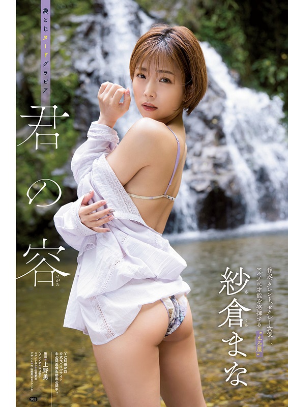 また巻中袋とじヌードグラビアには、作家、タレント、セクシー女優とさまざまな顔を持つ紗倉まなさんが登場している。