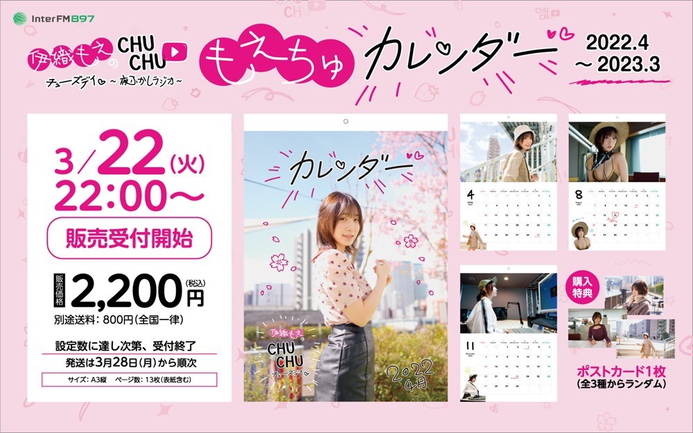 今回、第二弾となる番組グッズとして、番組カレンダーを販売することが決定した。伊織もえとしてカレンダーの販売は数年ぶりというファン待望の商品となる。4月スタートカレンダーとして、来年2023年3月までの12ヵ月カレンダーに使用されている画像は全カット撮り下ろしとなっている。