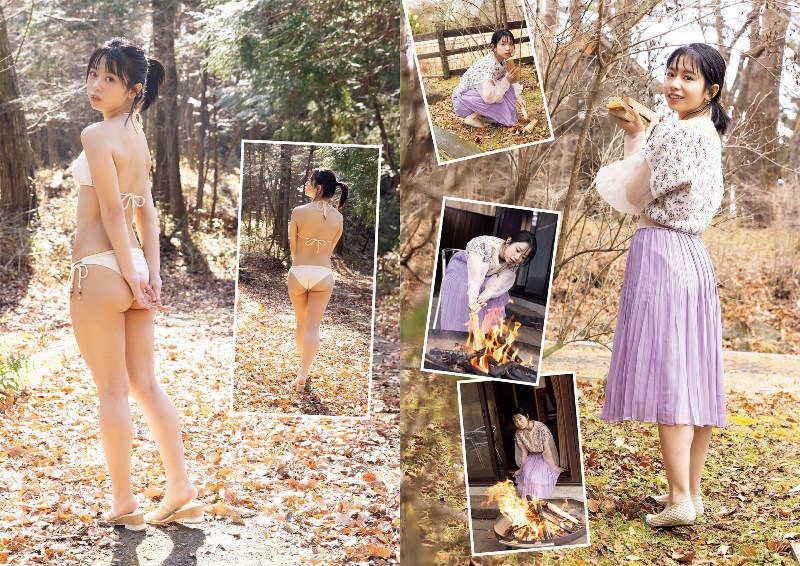 昨秋撮影が行われた本グラビア。落葉の中を遊歩したり、落ち葉を集めて焚火にも挑戦。さらに純白ビキニ & ポニーテールという最強コンボで外気浴を楽しむなど、日本の秋を存分に楽しんでいる。無邪気な姿に続き、爽やかスカイブルーの水着姿も。ギャップ感を溢れるグラビアを披露する。“吸い込まれそうな美ボディ”が見どころだ。