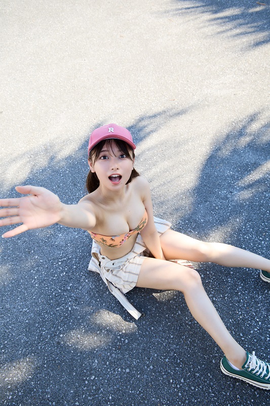 今回の誌面について、「私にはキャップにスニーカーといったカジュアルなスタイルのイメージがあるのか、毎回衣装に組み込まれているような気がするんです! 実は普段の性格や行動から『少年』というあだ名がつけられているんです(笑)。それに加えて、私自身そういったスタイルが好きなのでとても嬉しいですし、しっくりくるのでお気に入りです! 逆にボーダーの水着にかきあげヘアーのカットは、夕景なのも相まって中々雰囲気のある写真になっていてこちらもお気に入りです! 私っぽいものからギャップのあるものまで、まるぴのことを考えて衣装やヘアメイクを決めてくれているのだと思うと本当に幸せなことだなあと思います。一冊でいろいろな表情を見てもらえると思うので、お気に入りのまるぴを探してほしいです!」とアピールした。