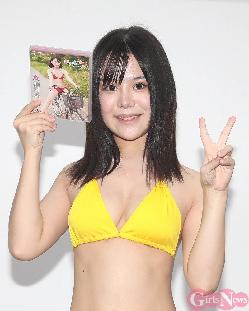 DVDの内容について「陸上部だったので走るシーンがありDVDの中ではリレーのバトン渡し練習をしています。体を動かしているので胸もお尻も揺れています。制服のシーンではブレザーを着ていちばん女子高生っぽいシーンです。ここでは海辺を歩きました。ほかに水着でブランコに乗ったり自転車の乗ったのは初めてしました。鉄棒やバランスボールでも楽しく遊びました。セクシーなのはお風呂のシーンでシャワーを浴びたり湯船に浸かっていろいろ動いたりしました。肩紐のない水着でセクシーになっています」と紹介。
