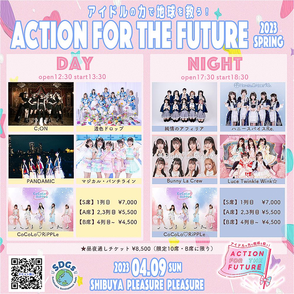 アイドルたちと一緒にSDGsを学び、行動する、新しい形のアイドルフェスティバル「ACTION FOR THE FUTURE 〜アイドルの力で地球を救う!〜」が、4月9日、東京・SHIBUYA PLEASURE PLEASUREにて開催決定。ナビゲーターのCoCoLo♡RiPPLe (ココロリップル)をはじめ、C;ON、透色ドロップ、PANDAMIC、マジカル・パンチライン、純情のアフィリア、ハニースパイスRe.、Bunny La Crew、Luce Twinkle Wink☆が出演する。
