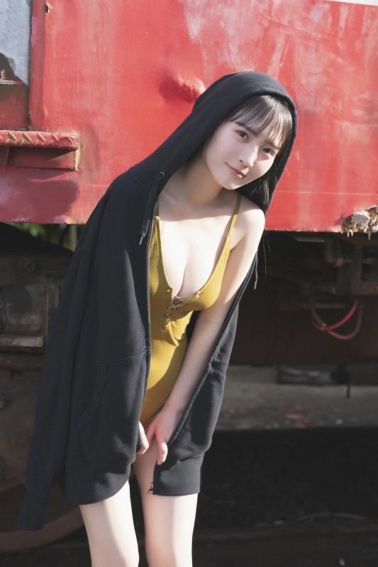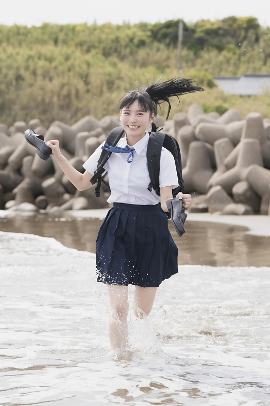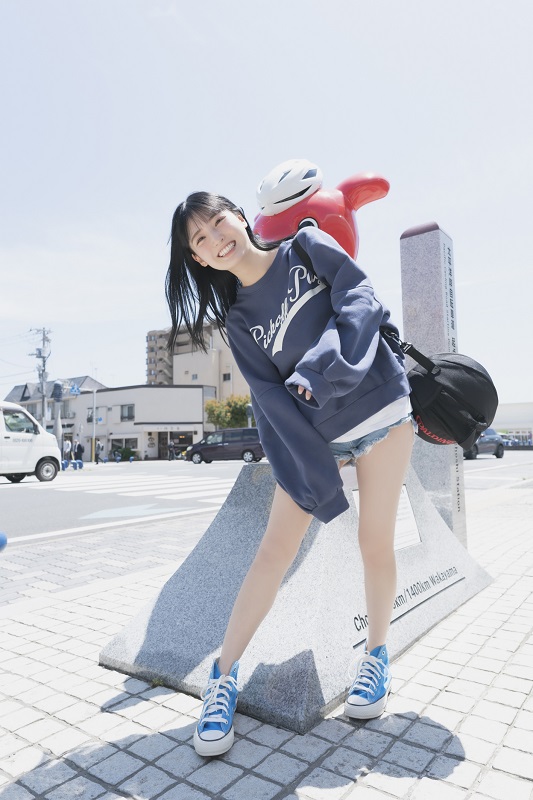 地元・千葉県銚子市で撮影された今号。「千葉の海で撮影したことは今まであったんですけど、本当の本当の地元とゆうか思い出いっぱいの場所で撮影できて嬉しかったです。まずスタッフさんたちとロケバスに乗って銚子の街を走るのも不思議な感覚だったし、、、なにより着いた瞬間になつかしくて、なかなか銚子に帰れていなかったので本当に安心しちゃってあの日はずっと顔がゆるみっぱなしだったと思います(笑)」と撮影日を振り返った。