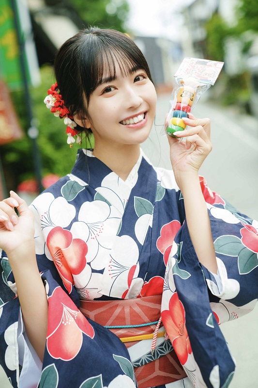 草津温泉で撮影されたという今回の表紙。「#2i2としてデビューしてすぐ、持病で入院をして3ヶ月近く休業していました。ベットから起き上がれないほど動けない状態だったので、外に出ることはおろか、窓からの景色をみるのも辛かったです。入院時期がお正月ということもあって旅行やお出掛けが好きな私にとって外との繋がりが全く感じられないいつも同じ景色の病室はすごく寂しかったです。コロナ禍真っ只中というのもあり面会に誰も来ることもできずずっと一人でした。そんなときにハマっていたのがYouTubeのライブカメラを見て、お出掛けしている気分になることでした。リアルタイムで外の世界と繋がってる気がしてとてもハマりました。その中でもお気に入りのライブカメラが草津温泉の湯畑のライブカメラでした。温泉がもともと大好きなので、湯畑のライブカメラをみて温泉あがりかなという浴衣の人々を見たりしてそこにいる気分を味わっていました。退院したら絶対ここに行く!と思っていました」と草津温泉にまつわるエピソードを明かした。