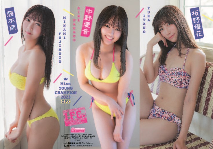 「ミスヤングチャンピオン2023」グランプリの中野愛音さん、板野優花さん、藤本南さんの3人が、10日発売の雑誌「ヤングチャンピオン」No.21(秋田書店、表紙=田中美久)のグラビアに登場している。
