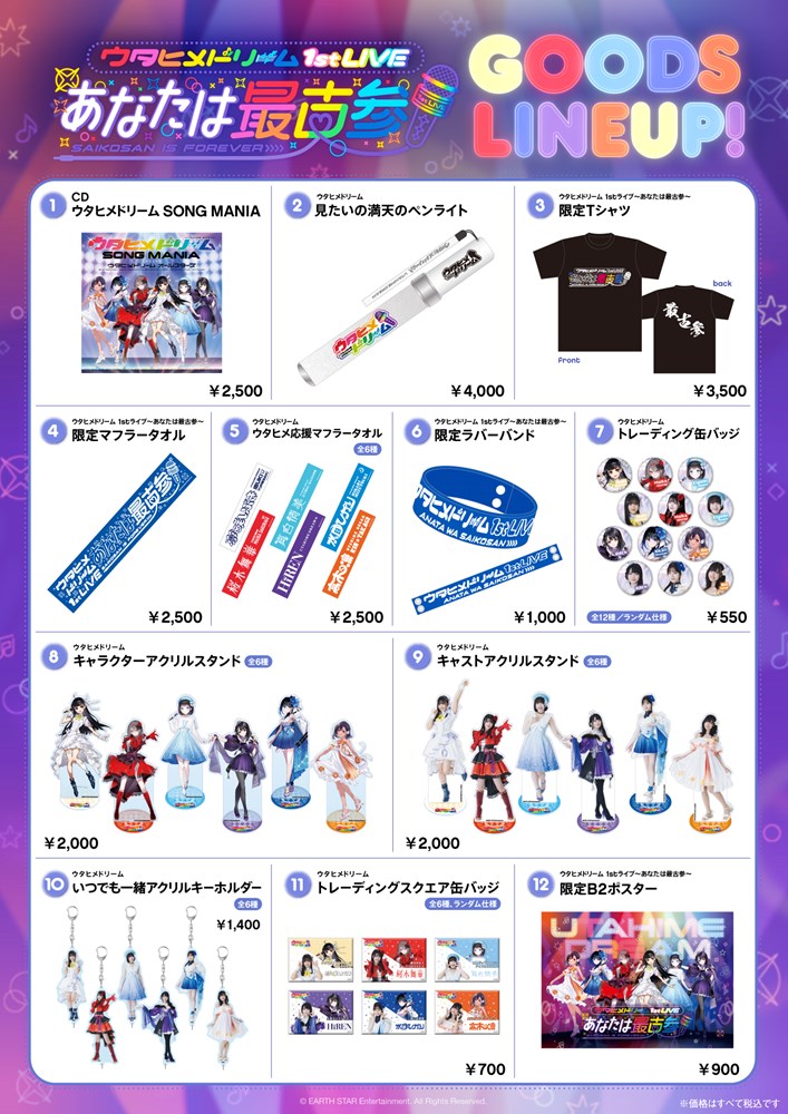 会場では、各種オリジナルグッズの発売が決定。ペンライトや限定Tシャツなどのほか、各キャストがキャラクターに扮したアクリルスタンドやキーホルダーなども発売される。さらに会計金額ごとに特典としてブロマイドのプレゼントも用意されている。