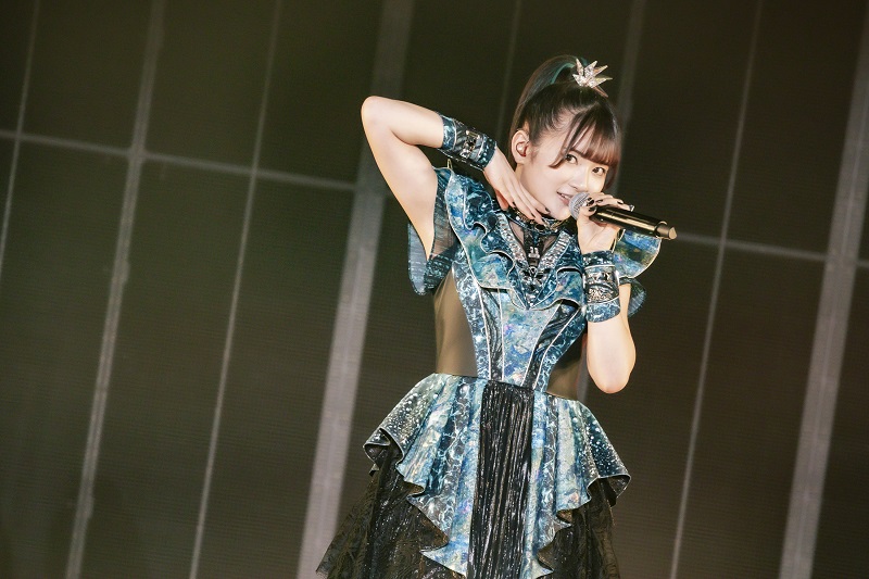 続いてスウィングジャズのドラムに合わせて「Hello! 豊洲PIT! 盛り上がる準備は出来てる?」と早くもオーディエンスを煽り、「Hey! Hey!」とオーディエンスも声と拳を上げ、一気に会場のボルテージがヒートアップすると、昨年のサマソニでも披露した「METALVERSE」オリジナルの“スウィングメタル”とも言えるアッパーチューン「Crazy J」がスタート。照明も一段と明るくなり、前回から一新されたレイクブルーとエメラルドグリーンを基調としたバトルスーツやインナーカラーがアップデートされたヘアースタイルなどもはっきりと見分けがつくようになった。中盤のコールアンドレスポンスで5人のメンバーが迫り出したフロントステージへ出てくると、「一緒にSwingしよう!」と呼びかけ、早くも会場がひとつになって盛り上がる。