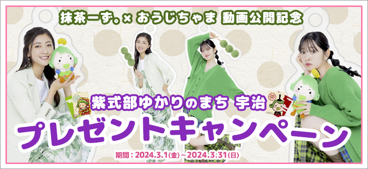 宇治市観光大使を務めるタレント・熊井友理奈さんとソロシンガー・鈴木愛理さんによる“抹茶ーず。”が、宇治ご当地キャラクター“チャチャ王国のおうじちゃま”とともに、宇治茶と源氏物語をテーマとした観光スポットなどを紹介するWEB動画を3月1日に公開。併せて公開を記念した、動画で紹介の観光施設や商店街を巡って利用すると、熊井友理奈さん、鈴木愛理さんの「宇治限定アクリルスタンドキーホルダー」などがもらえるキャンペーンを3月末までの期間行うことも発表された。