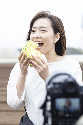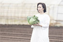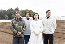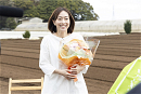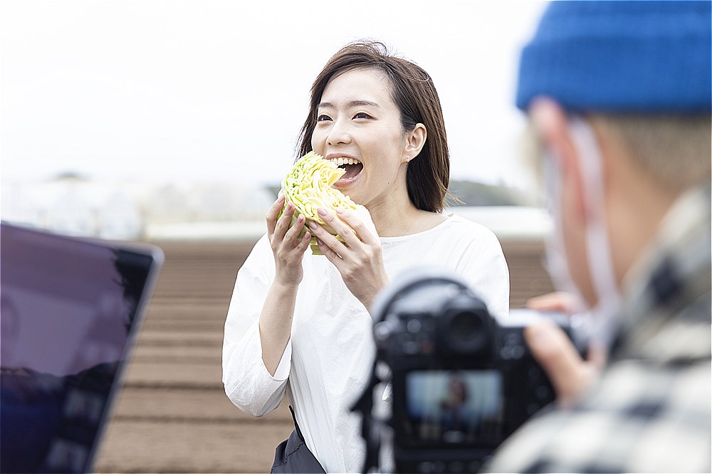 CM撮影は、風が強く吹く早朝の農場からスタート。当初は悪天候も予想されていたものの、石川さんが農場に到着したときには青空も見えるほどの天候に。大きな野菜を両手に抱え、石川さんは広大な農場の真ん中で、真剣なまなざしで撮影に挑んだ。時折、強く吹く風に苦戦する様子があったものの、終始笑顔で臨機応変に対応し撮影を乗り越えた。また、インタビューの際は実際にキャベツや大根を味わい、石川さんのおいしそうな表情に、生産者も満足した様子だった。