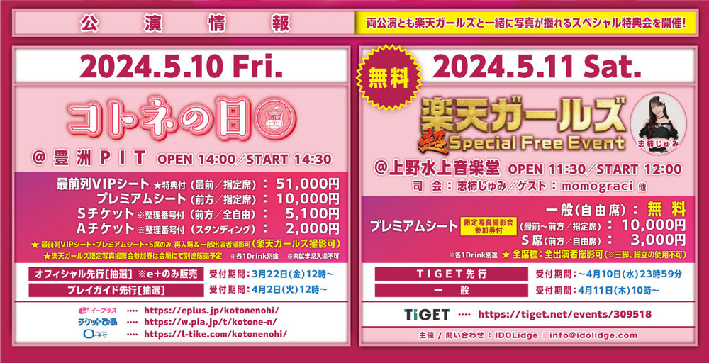 5月10日は東京・豊洲PITにて小桃音まいが主催するアイドルフェス「コトネの日」に出演。翌5月11日には上野水上音楽堂にて「楽天ガールズ 超Special Free Event」を無料にて開催する。