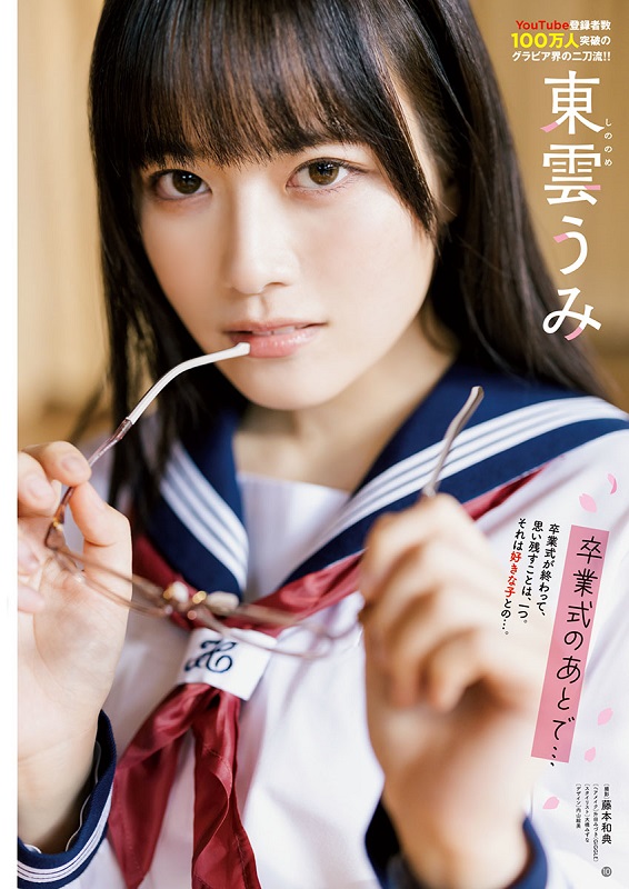 誌面ではセーラー服に身を包んだ東雲さんが登場。トレードマークのメガネを外し、ドキドキのシチュエーションでみつめる姿にキュンとなる。