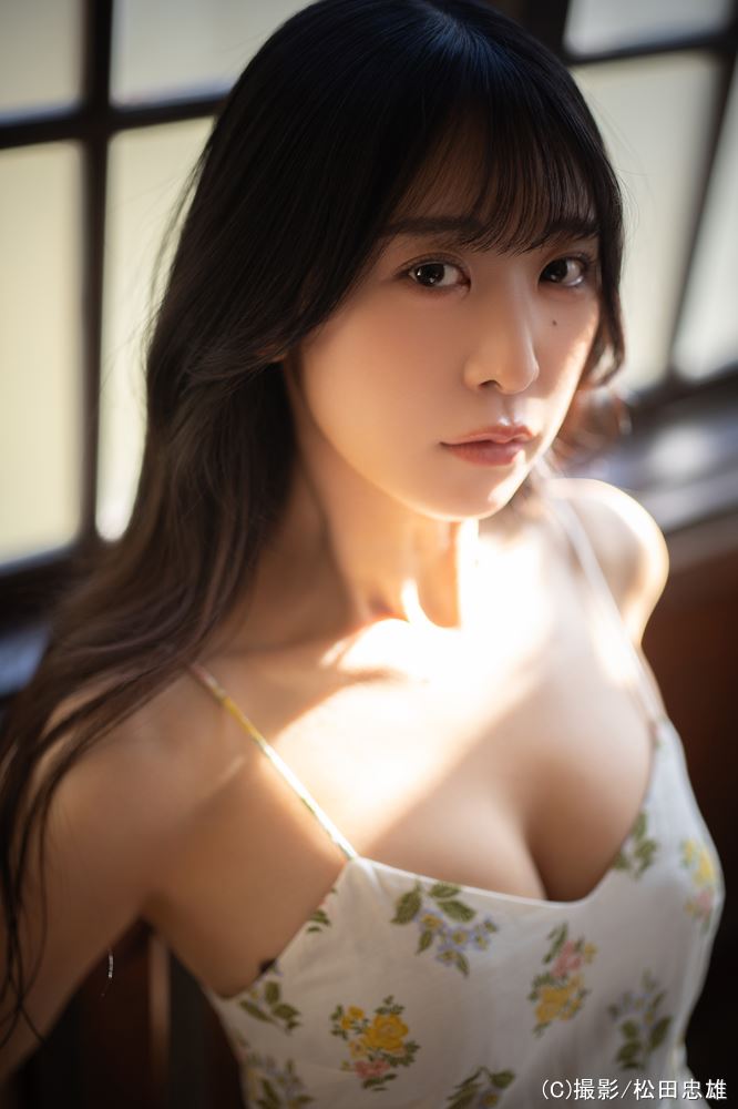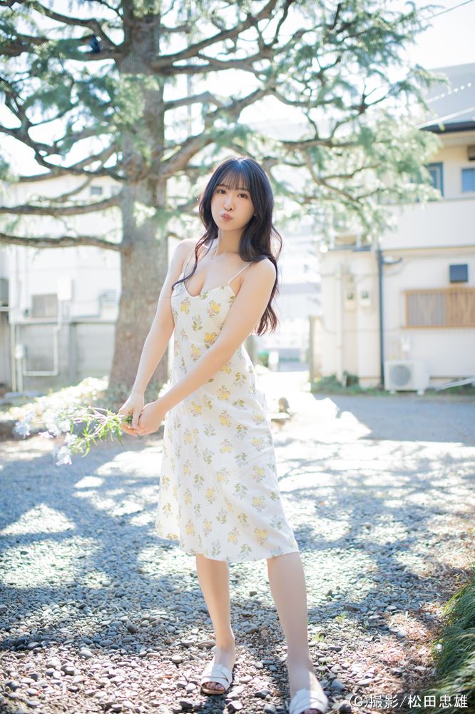 今回の撮影について「普段はキャラに沿ったような(令和の愛人)テーマや雰囲気の撮影が多かったりするのですが、今回は大人っぽさだけではなく透明感と少女感あふれるピュアな真島も沢山撮影をしていただきました! 小花柄のワンピースを着させていただいたのですが実はそのカットが自分でも新鮮でお気に入りです!」と紹介した。