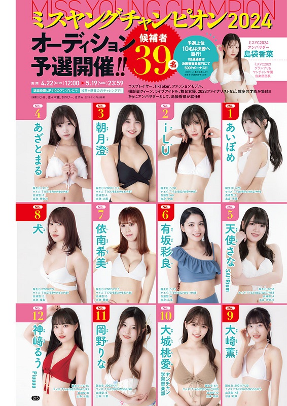 巻中グラビアではミスヤングチャンピオン2024オーディション予選を開催。コスプレイヤー、TikToker、ファッションモデル、撮影会クィーン、ライブアイドル、舞台女優など、今年も数多の才能が集結し、決勝進出をかけてホットな戦いを繰り広げる。