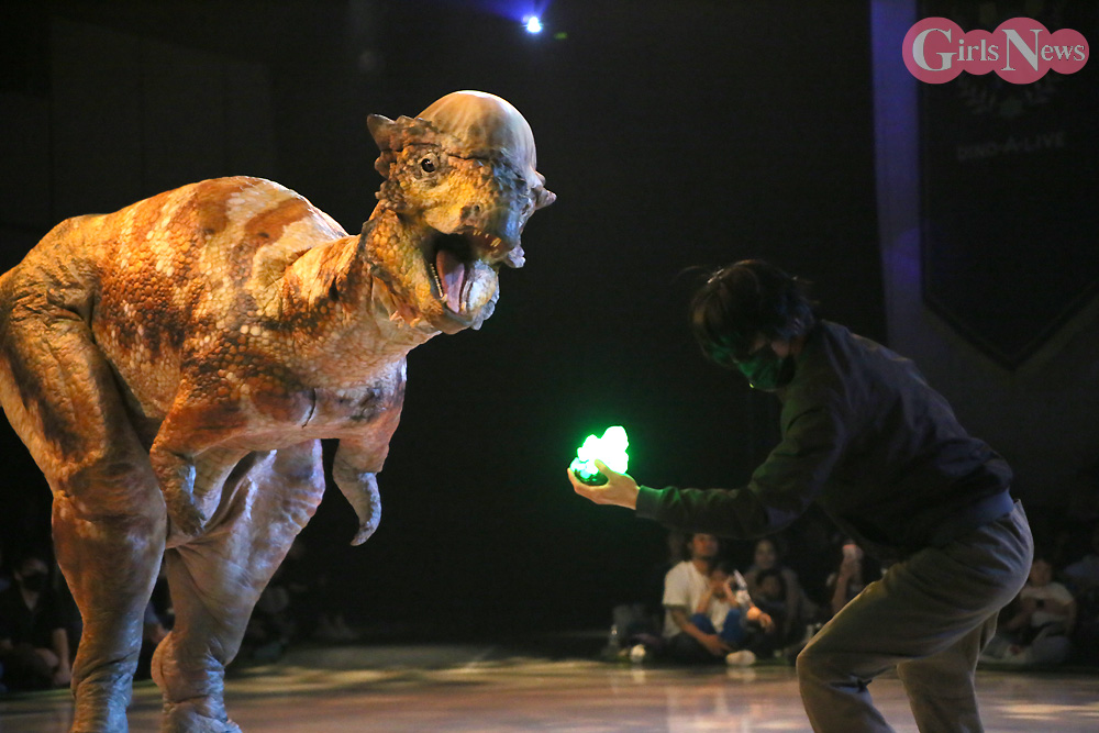 4年連続でナビゲーター役を務めている中村さんは、公演に先立って挨拶に立ち「毎年毎年さらにパワーアップしていると感じております。特に昨年のアリーナツアーを経て、新しい恐竜たちもたくさん増えました。今回はいままで1頭だったパキケファロサウルスが対で出てきたりします。DINO LIVE では、この DINO SAFARI が一番間近で恐竜を観察していただけるイベントなので、自分たちの頭の上を恐竜の顔や尻尾が横切ったり、手が届きそうな距離で体感いただける唯一の体験型エンターテイメントになっています」と紹介。
