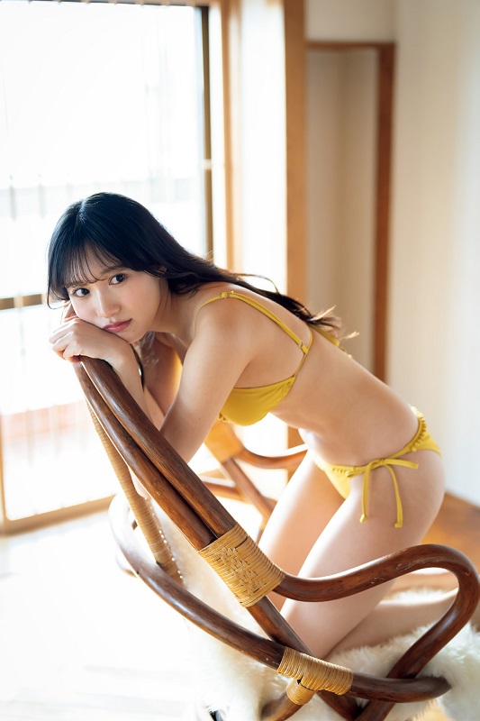 横野さんのグラビアでは、「“男をダメにする”危うい色香」と題して、昭和アイドル像を彷彿とさせる、赤いスイートピーに囲まれた横野すみれが登場。昭和レトロを感じるデザインの水着を、ポップに着こなしていく。青と白のコントラストが美しい水玉チューブトップ、胸元に赤いリボンをあしらったキュートなデザイン、幸福を呼び寄せるかのような黄色のビキニといった衣装を纏い、読者の目