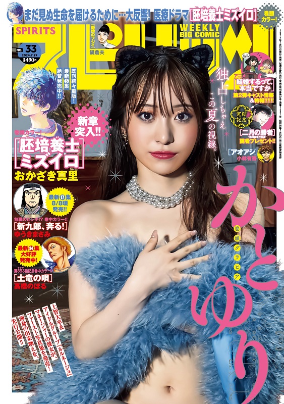 1st写真集『Lucky DUCK』が7月26日に発売される、かとゆりが、12日発売の「週刊ビッグコミックスピリッツ」33号(小学館)の表紙 & 巻頭グラビアに登場している。