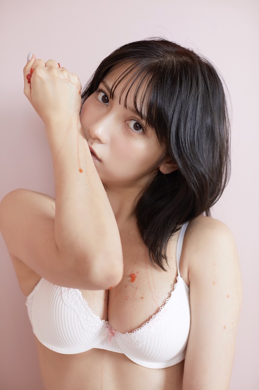 今回は「握る、垂らす」「隠れる」「はさまる、はさむ」「透ける」をテーマに「少しフェチっぽい撮影に挑みました」と紹介。「前回はリンゴと共に撮影したのですが、今回はイチゴと共に撮影して、握りつぶして体に塗りたくったりして(笑)、体中からいちごの匂いがしました(笑)」とエピソードも紹介した。