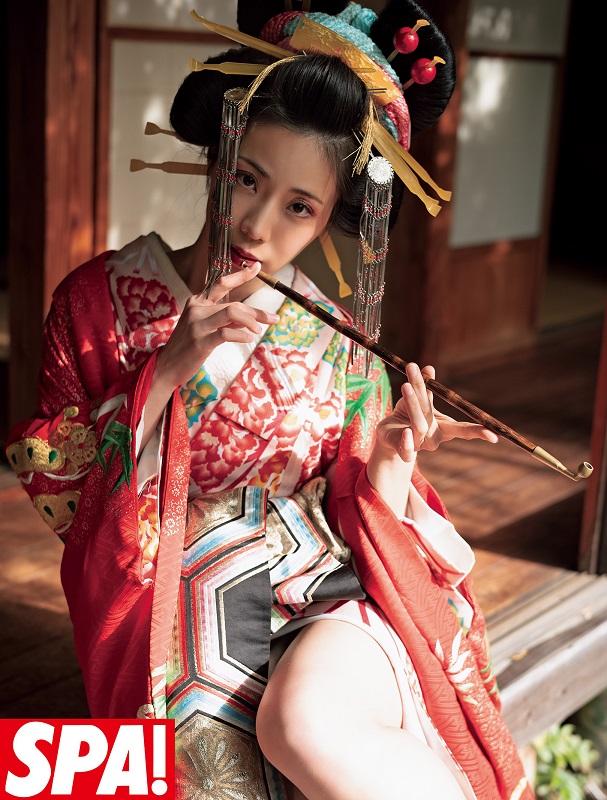 今回の誌面では自らの提案で「花魁」に挑戦。艶やかな姿を見せている。和とグラビアの融合、その仕上がりは誌面にてその目で確認を。