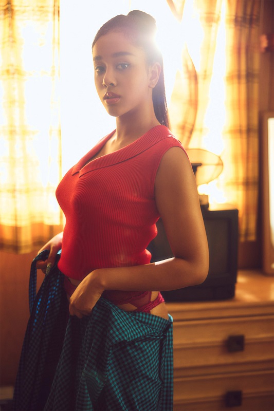 昭和のムードを醸し出すべく、アナログテレビ、昭和タンスが用意された民家で撮影。ハイカラな衣装に身を包みつつも、隠しきれないダイナマイトバディ。一枚ずつ丁寧に脱衣していくと豊満バストと、女性らしい美尻が……。昭和時代にタイムスリップしたハーフ美女の、妖艶な姿が見られる。