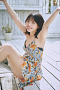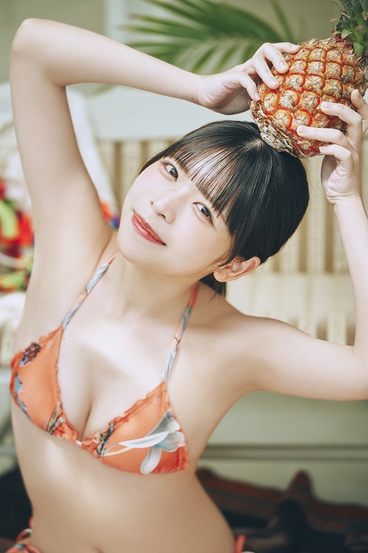 今回は「私が沖縄出身なので南国っぽい衣装を着させていただいたり本物のパイナップルを持った撮影をしていただきました! ハイビスカスをつけたりもしたので、見てくださる方にも沖縄の暖かい雰囲気を感じていただけたら嬉しいなと思います! それとこれは余談なのですが、初めての撮影だったのでカメラマンさんやスタッフさんに『かわいい~』と言われる度にすごく恥ずかしくなってました、、とにかく緊張した撮影でした!(笑)」と内容を紹介する。