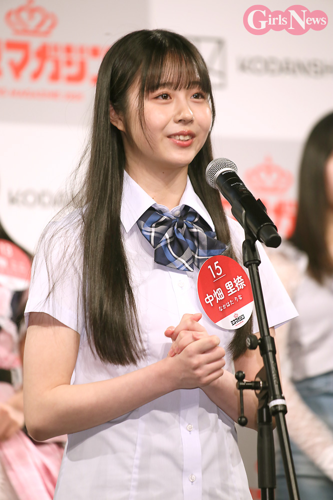 最年少の15歳、愛称は「なっち」。毛筆6段の習字、ピアノ、ドリンクが特技で、マカロン好き。制服とカーディガンでフレッシュさをアピールし、蛇をモチーフにした「進む」の習字を披露。進学と進歩の目標を表現した。