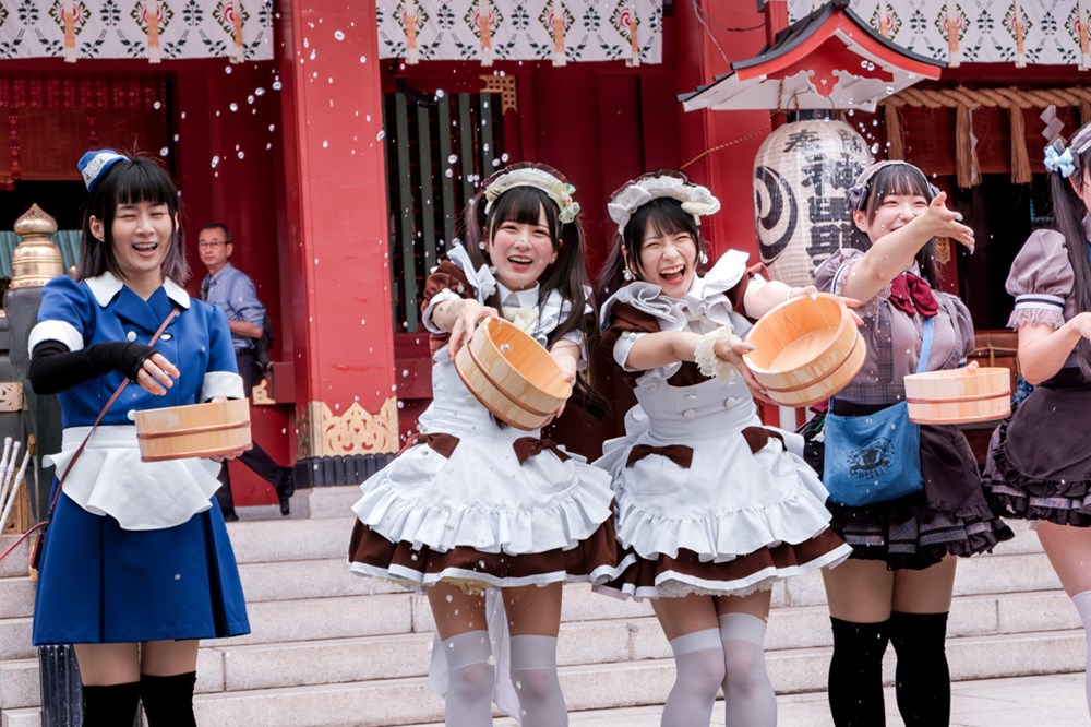 「あっとほぉーむカフェ」人気メイド、神田明神で打ち水 真夏の秋葉原に涼