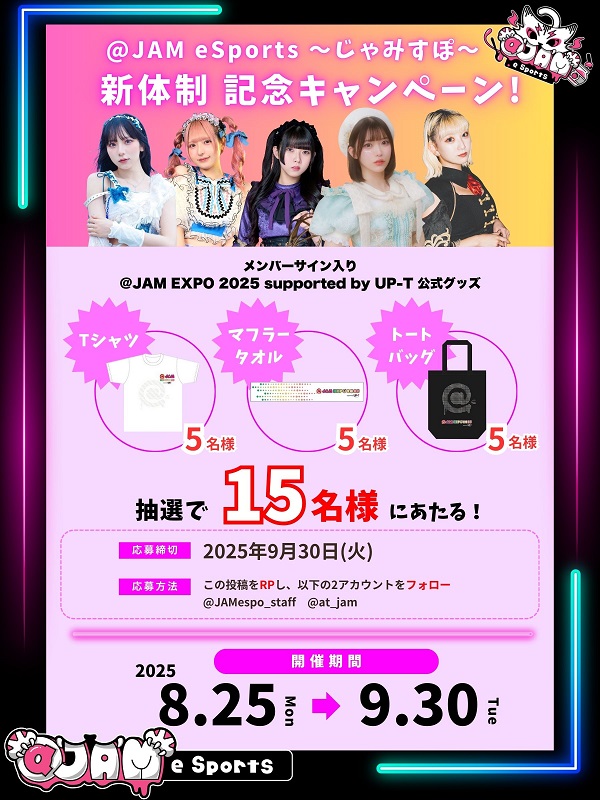 『@JAM eSports ~じゃみすぽ~』は、音楽イベント「@JAM」シリーズに出演経験のあるアイドルたちが“本気(ガチ)”でeSportsに挑むプロジェクト。今回の森本栞菜さんの加入により、チームは5名体制となり、より本格的なeSports活動を展開していく。
