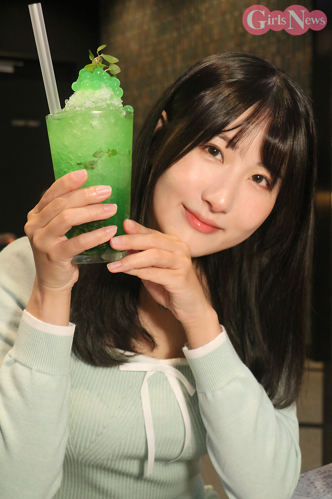 今回注文した緑の「推し色ドリンク」は「ボバモヒート」というミントが効いたカクテルで、ミントの清涼感がありつつも強すぎず、「飲むかき氷みたい」と独特の食感を表現した。ドリンクの上に乗っているのは「つぶつぶのゼリー」で、韓国で流行しているものだという。