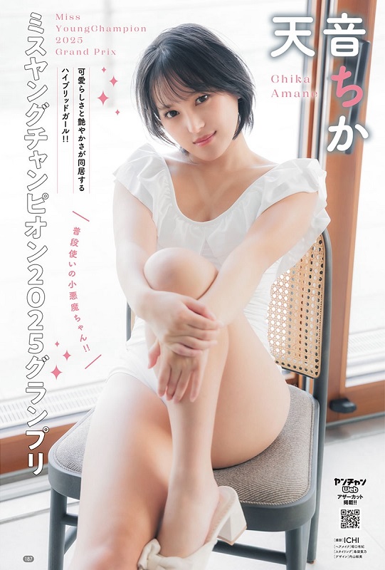 「ミスヤングチャンピオン2025」グランプリの天音ちか、心愛が、18日発売の雑誌「ヤングチャンピオン烈」No.12(秋田書店)のグラビアに登場している。